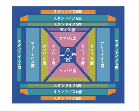 | チケット料金 | ■タマリS席(1階席) 17,000円 ※記念座布団付き ■タマリA席(1階席) 15,000円 ※記念座布団付き ■アリーナイス席(1階席) 11,000円 ■スタンドイスS席(2階席) 8,000円 ■スタンドイスA席(2階席) 6,000円 ■スタンドイスB席(2階席) 4,000円 【オプション】 ■相撲土産セット(特製幕の内弁当、お茶、相撲土産3種) 5,500円 ■弁当セット(特製幕の内、お茶) 2,500円 ※消費税込み ※1回のお申込みにつき4枚までとなります。 座席図はこちら |